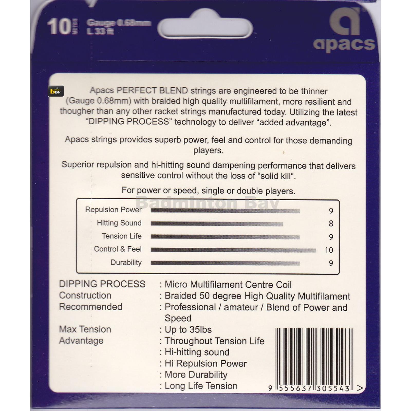 Apacs Perfect Blend Strings are engineered to be thinner (Gauge 0.68mm) with braided high quality multifilament, more resilient and tougher than any other racquet strings manuractured today.